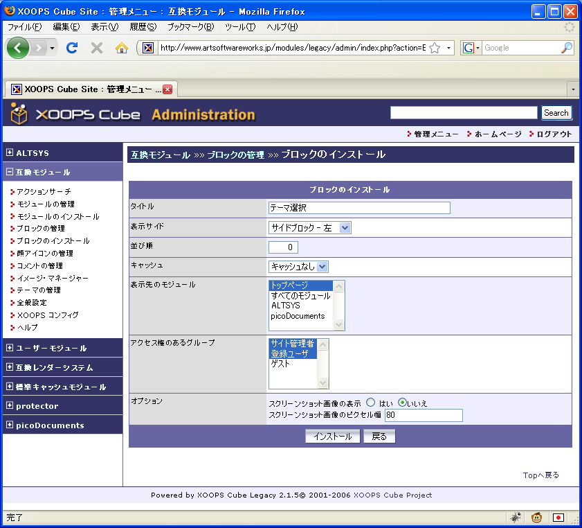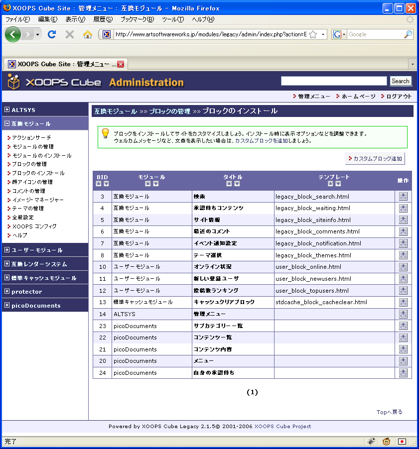 ブロックのインストールは、管理メニューの「互換モジュール」「ブロックのインストール」で行う。
