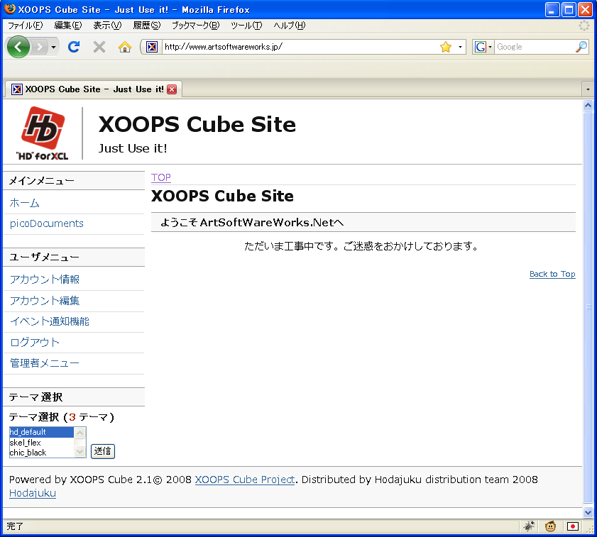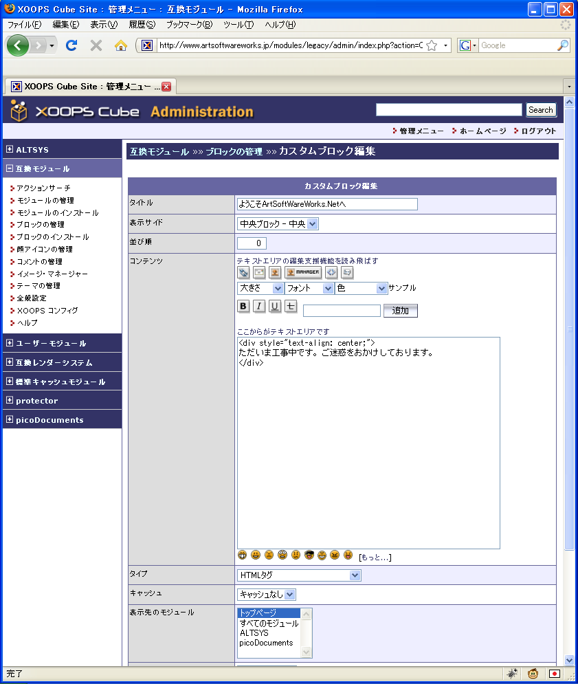 XOOPS Cubeでは自分で好きなメッセージを作ってそれをブロックとして追加することができる。それが「カスタムブロックの追加」だ。とりあえず中央ブロックに何も表示されていないのは少々寂しいので、中央ブロック-中央に「工事中」のメッセージを表示してみることにする。