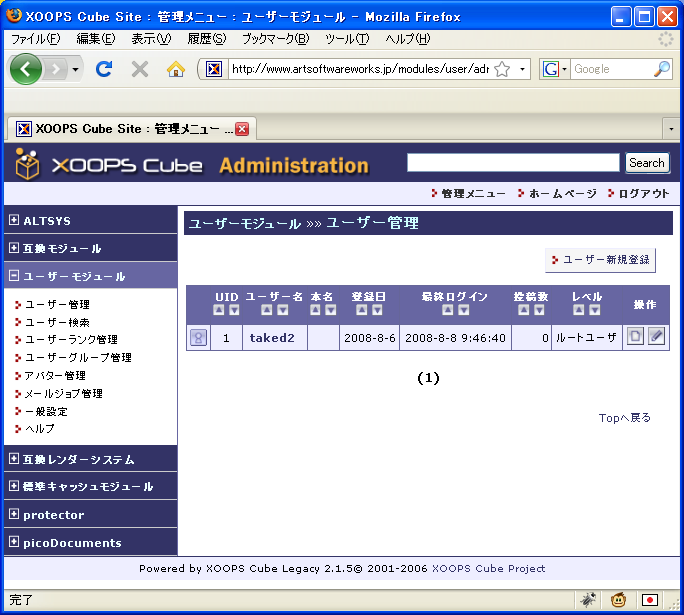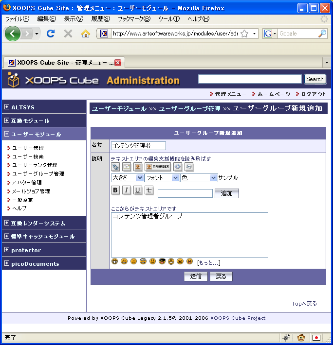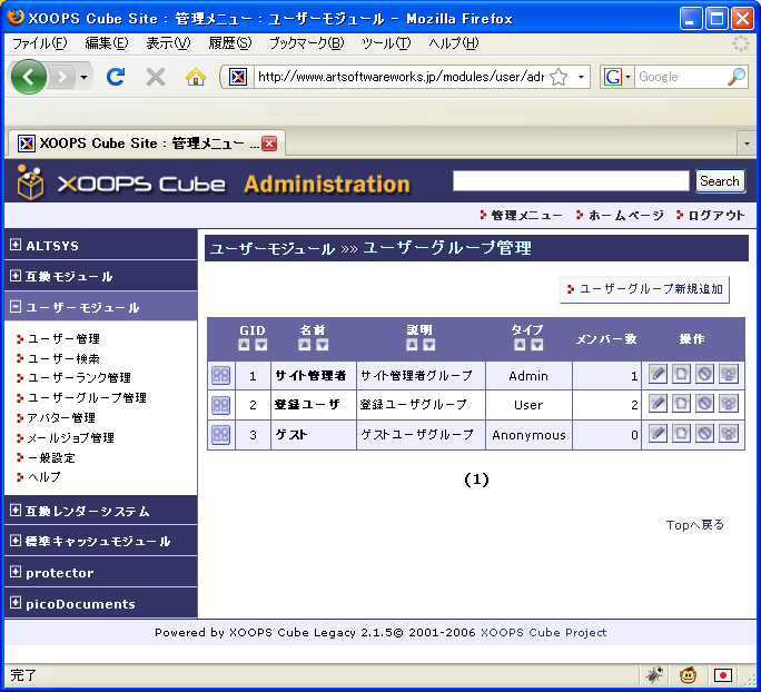 ユーザーの削除ユーザーを削除する場合は、管理者メニューの「ユーザーモジュール」「ユーザー管理」より行う。削除したいユーザーの右側の「操作」の「削除」アイコンを押せばいい。 グループの追加XOOPS Cubeでは最初、「ゲスト」「登録ユーザ」「管理者」の3つが設定されている。管理者が1人という場合はこれでもいいのだが、運用を考えると「コンテンツ管理者」ぐらいのグループを作っておいた方がいいだろう。 「ユーザーグループの新規追加」を押して登録画面へ。