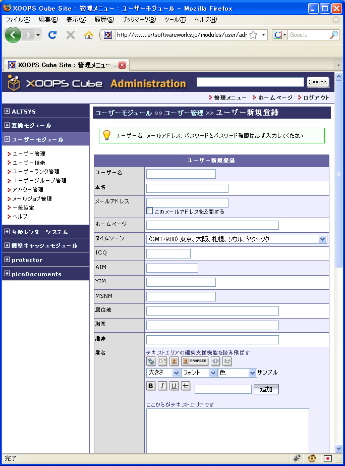 うちのサイトでは自由にユーザー登録してもらってもかまわないサイトで、登録ユーザーとなったらWikiなどの編集に参加できる。ただしどのコンテンツもゲストがコメントをつけることを許可しているので、登録ユーザーは身元(メールアドレス)の分かったゲストとして扱っている。実際にコンテンツの編集を行いたい人は「管理者」よりは権限が低いが一般の登録者よりは権限の高い「コンテンツ管理者」グループに属することになる。 ユーザの追加管理者がユーザーを手動で追加する場合は、管理者メニューの「ユーザーモジュール」「ユーザー管理」より行う。 ここで「ユーザー新規登録」を押すと登録画面に移る。