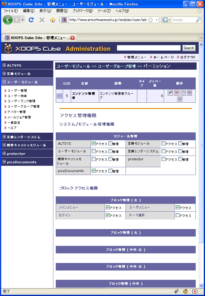 「送信」を押せばグループが追加される。 グループの削除グループを削除する場合は、管理者メニューの「ユーザーモジュール」「ユーザーグループ管理」より行う。削除したいグループの右側の「操作」の「削除」アイコンを押せばいい。 グループへのユーザーの登録ユーザーをグループに登録したい場合は、管理者メニューの「ユーザーモジュール」「ユーザー管理」より行う。登録したいユーザーの右側の「操作」の「編集」アイコンを押す。「ユーザーの編集」画面の「グループ」で所属させたいグループを選択する。グループから外したい場合もここで設定すればOK。 アクセス権の設定モジュールを追加した場合などは、アクセス権を適正に設定しなければならない。通常は安全設定でディフォルトではゲストにアクセスを許可してないので、まずこれを行わないとゲストにはメニューが表示されない、などということになってしまう。