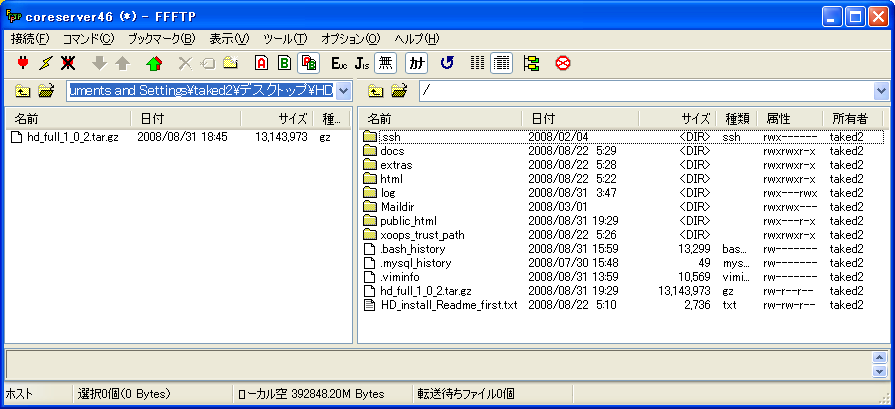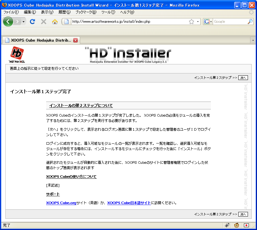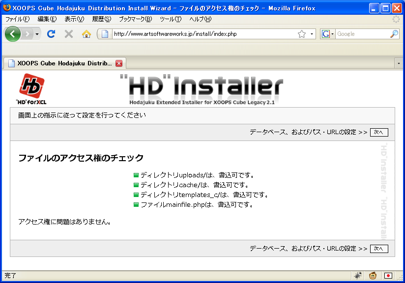 サイト内の現在位置です: 5-1.インストールすっぞ ~ホダ塾ディストリビューション(HD-1.0.2)編~必要なパッケージを入手する何はなくてもパッケージがないことには話が始まらない。というわけで、まずパッケージの入手。最新版の入手方法はここを参考に。 最新のXOOPSを入手する http://www.xugj.org/modules/documents/index.php?content_id=6 この中の「最新Hodajuku Distributionのダウンロードはこちら(Hodajuku Distribution開発サイト)」からホダ塾ディストリビューションを入手する。執筆時点での最新版はHD-1.0.2でXOOPS Cube Legacy 2.1.5ベースだ。 アップロード・解凍Zipパッケージの解凍・アップロードは1.0.1b編で説明したので、今回はtar.gzパッケージでのインストール方法を紹介してみよう。tar.gzパッケージだとファイルをアップロード後、サーバ上で解凍することになる。この方法だとパーミッションがそのまま復元できるので余計な手間がないし、なによりアップロード時間が早くすむのでお勧め。FFFTPのように環境によっては大量のファイルをアップロードすると詰まってしまう場合もこの方が簡単でいいだろう。 解凍tar.gzパッケージを解凍する。 tar xvzpf hd_full_1_0_2.tar.gz 解凍すると次のようなファイルやディレクトリができる。 この中で「HD_install_Readme_first.txt」はインストール前に必ず目を通しておく。 次に「html」ディレクトリをドキュメントルート内に移動する。 mv html public_html/ うちはこの後、htmlディレクトリの名前を「default.(ドメイン名)」に変えている(理由は1.0.1b編参照のこと)。 rm -rf docs rm -rf extras 準備が終わったら、いよいよインストール。 インストール第1ステップスタートhtmlをアップロードしたディレクトリにアクセス。次のような画面が表示されるだろう。 表示されない時は解凍かドメインの設定が間違っているのでもう一度見直すこと。「次へ」を押すと、イントロダクションが表示される。 ふんふんと読んどいて、「アクセス権のチェック」を押す。すると次のような画面が表示されるだろう。 アクセス権の設定を確認したら「次へ」を押す。 データベース、およびパス・URLの設定ここで作成したMySQLのデータベースの情報を設定する。CORESERVERの場合、「データベースユーザ名」と「データベース名」は同じものを指定する。また「データベースパスワード」は設定したものを指定すること。「テーブル接頭語」「SALT」はそのままでかまわない。 「XOOPS Cubeへのパス」はhtmlをアップロードしたディレクトリであることを確認。「XOOPS CubeへのURL」ではドメインのURLが指定されているはずだ。同様に「XOOPS_TRUST_PATH」がxoops_trust_pathをアップロードしたディレクトリであることを確認する。なおこれらの設定には末尾に「/」をつけないこと。 確認したら「設定の保存」を押す。 ここで設定した情報は、全てhtmlディレクトリの「mainfile.php」に書き込まれるので、後で設定を変更したい場合はこのファイルを修正すればよい。 「次へ」を押すと「パス・URLのチェック」に進む。 今までの設定で間違いなければ「次へ」を押す。 html側のuploads/wizmobileのパーミッションが適正ではないので設定し直す。設定が終わったら「再読込」を押す。 この画面が表示されたらOK。「サーバセッティング」に移ろう。 サーバセッティングここで、XOOPS_ROOT_PATH(htmlのディレクトリ)に、.htaccessファイルを追加する。内容は、 php_value mbstring.http_input pass だ。このファイルは自動追加されないので手動で追加しておこう。追加したら「次へ」を押す。 この画面が表示されたらサーバセッティングOK。「データベース設定の確認」へ。 データベースの設定前に設定したデータベースの設定が表示されるので、「データベースをチェック」を押す。 この画面が表示されたらデータベースの接続はOKというわけだ。もし表示されない場合はデータベース関連の設定を見直すか、もう一度データベースを作り直す所からやり直してみる。特にデータベース名の設定が間違ってないか注意しよう。 テーブルが正常に作成されたら「データの生成」へ。 データの生成ここで管理者の情報を設定する。管理者ユーザ名とか後で変更しようとすると結構大変なので間違わないこと。あと管理者パスワード忘れると今後一切作業ができなくなってもう一度構築やり直し、ってことになるのでくれぐれも忘れないこと。 が表示されたらデータ生成完了。「完了」へ。 この画面が表示されたら、インストールの第1ステップは完了。これから第2ステップに入る。なお第2ステップでは今までのように親切なガイドはないし、失敗しても教えてくれないのでちょっと注意が必要。 インストール第2ステップ第2ステップではまず次の画面が表示される。 ここで先ほど設定した管理者ユーザ名と管理者パスワードを入力。正常にログインできたら次の画面が表示されるだろう。えっ、ログインできない? 残念、その場合はもう一度第1ステップの最初からやり直し。 ここで必要なモジュールを指定す