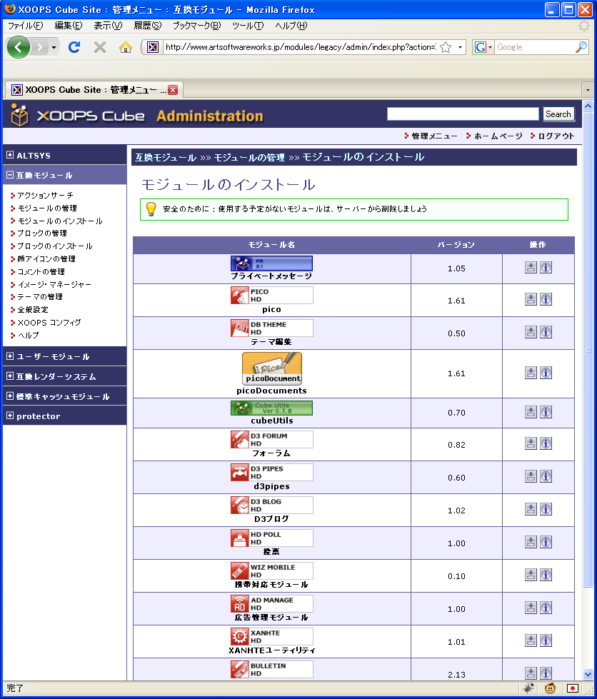 さてXOOPS Cubeでは頻繁に行う基本設定がいくつかある。その中でも最も重要なのがモジュールの管理だ。前にも説明したようにXOOPSでは機能追加をモジュールによって行う。そのため、この基本操作をマスターしておくことは必須ともいえる。 モジュールの入手自分のサイトでどんなサービスを提供するのかは、全て管理者の胸先三寸。自分でモジュール作れるならそれに越したことはないが、普通はモジュールをどっかから入手することになるだろう。その場合、以下の点に注意する。