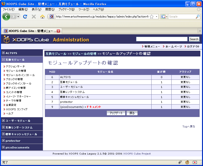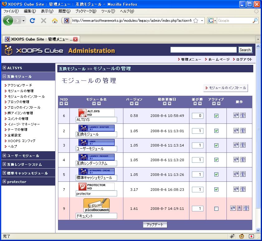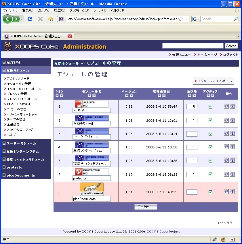 モジュールの管理アップロードが終わったら管理者メニューの「互換モジュール」「モジュールの管理」で管理を行う。まあここらあたりは実例で説明した方が分かりやすいので、静的コンテンツ表示用のモジュールであるpicoで話を進めてみよう。 実例 ~picoの場合~ホダ塾ディストリビューションに入っているpicoのバージョンは1.60なので少々古い。すでに1.61がリリースされていたのでダウンロードしておく。 http://xoops.peak.ne.jp/md/mydownloads/singlefile.php?lid=96&cid=1 解凍して、xoops_trust_path、html側共にアップロードする。 cp -r pico picoDocuments モジュールのインストール管理メニューの「互換モジュール」「モジュールのインストール」を選択。次のような画面になっているだろう。 ここでモジュール名「picoDocuments」の右側の「操作」の左側の「インストール」アイコンを押す。 「モジュールインストールの確認」が表示されたら「インストール」を押す。 「モジュールインストール終了」が表示されたらOK。この時、モジュールインストールログをよく読んでおくこと。モジュールがインストールできない場合は、主にパーミッションの設定が適正でないことが多いので注意する。 モジュール名の変更次に「互換モジュール」「モジュールの管理」を選択。モジュール名に「picoDocuments」が追加されているのを確認する。このモジュール名は、メインメニューで表示されるメニューになるのでこのままだと少々まずい。モジュール名を「ドキュメント」に変更して、「アップデート」を押す。 変更を加える部分が赤くなっているのを確認して、アップデートを押す。 メインメニューの表示順を変えるメインメニューに表示される順番を変えたい場合は、「互換モジュール」「モジュールの管理」で、モジュールの「並び順」で設定する。1以上に設定されたモジュールは小さい順からメインメニューに表示される。 メインメニューに表示しないモジュールをメインメニューに表示したくない場合は、「互換モジュール」「モジュールの管理」で、モジュールの「並び順」を0に設定する。 モジュールのアップデートモジュールをアップデートする場合は、アップロード後に「互換モジュール」「モジュールの管理」で「バージョン」にアイコンが表示される。それを押せばアップデート完了。 モジュールのアンインストールモジュールをアンインストールする場合は、いきなりディレクトリを削除してはいけない。設定情報やデータがMySQLに書き込まれているため、それをクリーンにする必要があるのだ。 「非アクティブ」が赤く表示されているのを確認したら「アップデート」を押す。 「モジュールの管理」に戻ったら、「操作」に「アンインストール」アイコンが追加されているのを確認する。これを押せばOK。