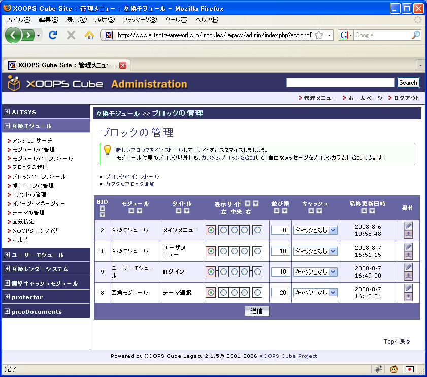 ブロックの並び順を変えるには管理メニューの「互換モジュール」「ブロックの管理」で行う。