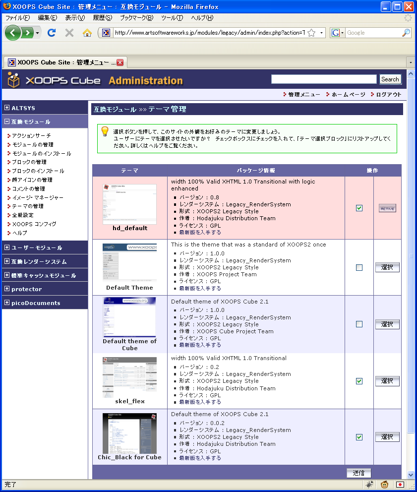InternetExplorerは1つのバージョンしか入れられないのでチェックする場合に頭の痛い問題だが、このツールを入れることで複数のバージョンでのチェックを行うことができる。 IETester http://www.my-debugbar.com/wiki/IETester/HomePage IETesterではIE5.5/6/7/8Beta2をチェックすることができる。なおIE本体のバージョンも上げておくこと。 しかしWindows/Macintosh/LinuxとOS別にもかなりの種類がある。これらの環境を用意するのも大変なので、主要なブラウザの表示をスナップショットで見せてくれるサイトもある。 Test your web design in different browsers http://browsershots.org/ スナップショットを取りたいURLとブラウザの種類を設定すれば約30分でその結果を教えてくれる。ただし仮想環境で海外版のOS上のブラウザで見ることになるので、あれっ、という環境がまともに表示されないこともある。まあ覚えておくと便利ぐらいでいてほしい。個人的にはEUCでサイトを構築していたときは化け化けで頭が痛かったのだが、UTF-8にして少々はよくなったかな、って感じである。 テーマの入手テーマを入手するにはGoogleあたりで「XOOPS テーマ」で検索かけてみるのが一番だが、何しろ数が多いし、すでに提供を止めている所も多い。またフリーではなく有料のテーマも多いので使用条件をよく確認した方がいいだろう。 Xoopsのテーマがフリー配布まとめ http://webhackr.blog105.fc2.com/blog-entry-34.html テーマのアップロードテーを入手したらそれをアップロードする。XOOPS Cubeではテーマはhtml側のthemesディレクトリ内にテーマごとにディレクトリ別で格納されている。名前がバッティングする場合はリネームしておくこと。 テーマの管理アップロードしたテーマを使えるようにするには管理者メニューの「互換モジュール」「テーマの管理」で行う。 選択したいテーマの「操作」のチェックボックスをオンにしておく。なお「Active」になっているテーマがディフォルトのテーマになる。 テーマの選択テーマを選択する場合はブロックの追加で「テーマ選択」ブロックを追加しておく。 テーマの削除テーマを削除したい場合は、テーマの管理で「操作」のチェックを外して、themesディレクトリからテーマを格納しているディレクトリごと削除すればよい。 テーマをいじったのに変更されない時はテーマをいじったのにブラウザで表示が反映されない、と思ったときは管理者メニューの「互換モジュール」「全般設定」の「themes/ ディレクトリからの自動アップデートを有効にする」が「はい」になっているか確認する。これが設定されていないとちゃんと反映されない。テーマが決まってしまえば、このオプションは「いいえ」にしておく。 テーマのカスタマイズ ~うちの場合~うちの場合はホダ塾ディストリビューションの「hd_default」をベースにちょこちょこカスタマイズしている。ベースとなったテーマは印刷用のスタイルが別だし、カラムの幅や色といった設定が別ファイルに分かれているので使いやすい。またメッセージリダイレクトが中央ブロック上部に表示されるの気に入ってる。ただし提供されているテーマは元々テーブルレスレイアウトなのだが、うちの環境ではIE6で表示崩れが起こる事があるので、テーブルレイアウトに大幅に修正している。もし参考にしたい人がいれば提供しますのでご連絡を。