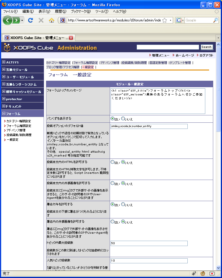 インストールが終わったら、管理メニューの「フォーラム」の「一般設定」を選択する。