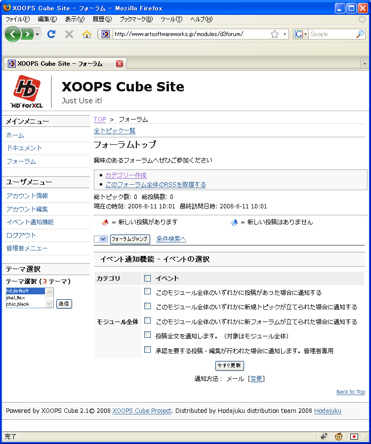 モジュールでまず最初に何を入れるかというと、d3forumだろう。サイトでコメントサービスを追加するというのはそう難しくないのだが、XOOPS標準のコメントシステムだと検索にうまくかからないし少々管理がしにくい。ということでd3forumを標準のコメントシステムの代わりに使うのが昨今の流行。d3forumのコメント統合に対応したモジュールも増えてきた(対応していないモジュールでもちょっとした変更で対応可)。今後必須となるモジュールなので最初に入れておきたい。