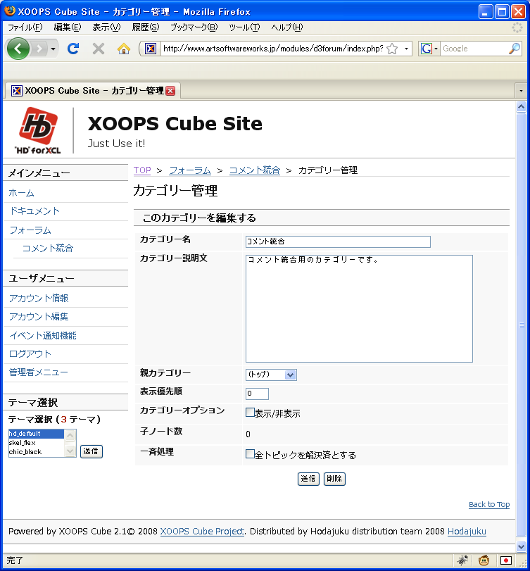 d3forumではフォーラムはすべていずれかのカテゴリーに属することになるので、まずカテゴリーを用意する。どんなカテゴリーを用意してもいいのだが、最低限コメント統合用のカテゴリーは分けておいた方が何かとやりやすい。