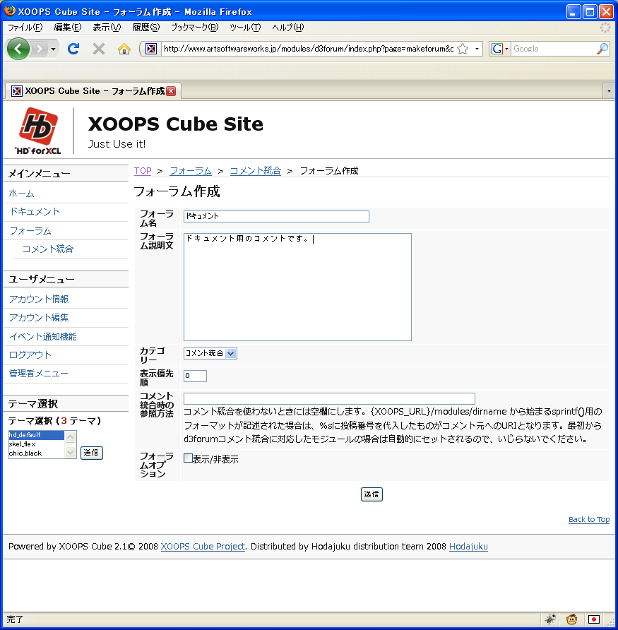 カテゴリーを作るには、表のメニューの「メインメニュー」の「フォーラム」で作成したいカテゴリーを選ぶ。ここで「フォーラム作成」を選択すると次の画面になる。