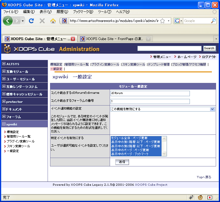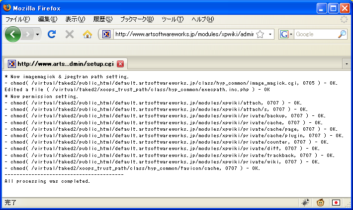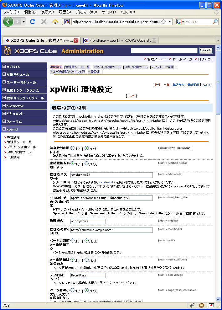入手とインストールxpWikiの最新情報はここを参照のこと。 XOOPSマニア http://xoops.hypweb.net/ 最初にパッケージ版を入手して、それから多分TRUST側の最新版があるから、それを上書きしておく(TRUST側のmudules以下。パッケージ版にはclassも含まれているので上書きする位置を間違えないこと)。バージョンが上がった場合のアップデート方法は上記サイトに書いてあるのでよく読んでおくこと。 アップロードしたら、モジュールのインストールをする前にXOOPS_ROOT_PATH/modules/xpwiki/admin/setup.cgiに実行権限(705ぐらい)を与えてブラウザからアクセス。これを忘れるとパーミションの設定ができていなくてインストールに失敗するので注意。 その後、モジュールのインストール。インストールが終わったら、まず管理者メニューのxpWikiを選んで「ページ情報DB更新」を行う(「管理用ツール一覧」「データベースシンクロ」を選んでも同じ)。 「実行」ボタンを押し、進捗状況に「すべての処理が完了しました。」と表示されるまでは触らないこと。 環境設定xpWikiの動作環境の設定は、管理者メニューのxpWikiの「環境設定」で行う。