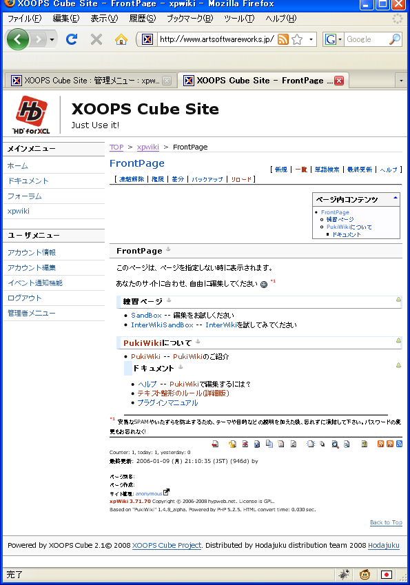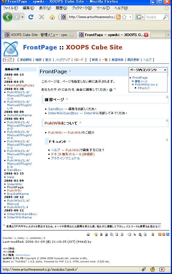 xpWiki標準。defaultとxpwikiは同じスキン。XOOPSテーマ下で表示されるのでインターフェイス的には違和感がない。