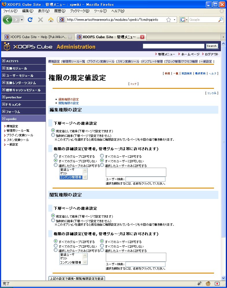 ページ権限の規定値設定xpWikiは最初誰でもページの作成、編集ができる。Helpページを読むと「Wikiとはそんなもの」とか書かれているのでつい信じてしまいがちになるが、PukiWikiとは違ってxpWikiではXOOPSのアクセス権限の設定を流用することができる。つまり、原則編集不可ということも設定可能。これを設定するには「管理用ツール一覧」「ページ権限の規定値設定」から行う。