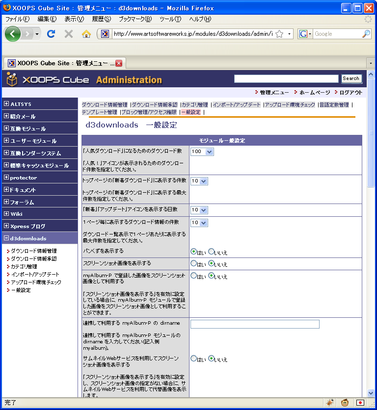 d3downloadsの基本的な設定は管理者メニューの「一般設定」で行う。