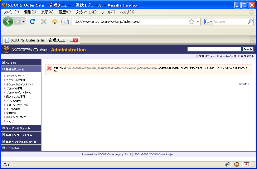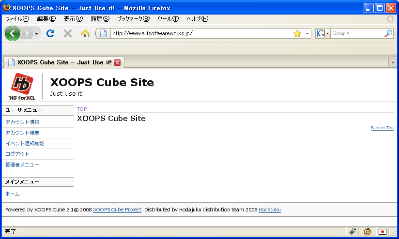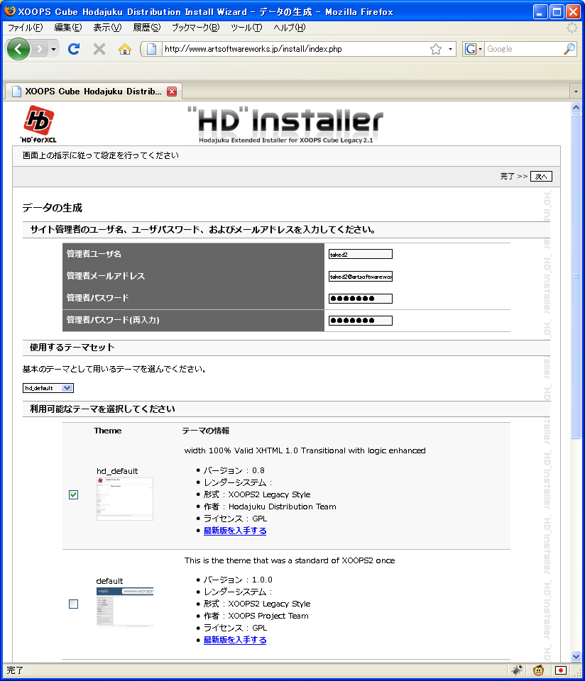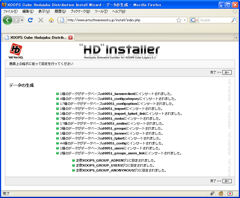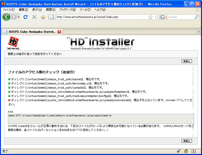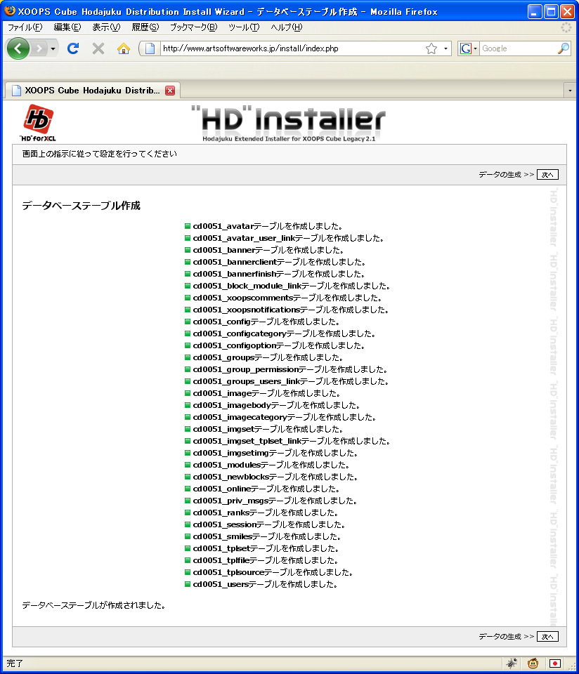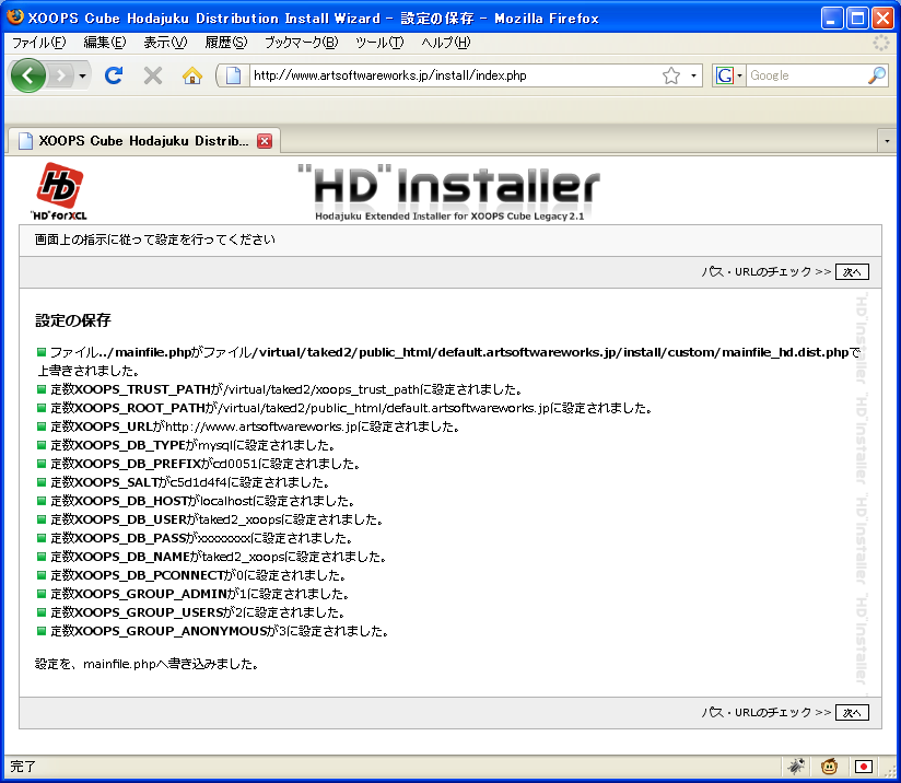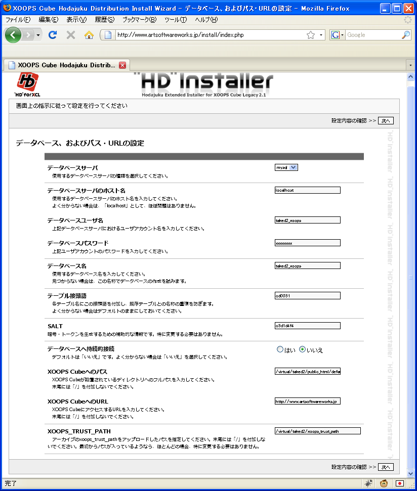 サイト内の現在位置です: 5-1.インストールすっぞ ~ホダ塾ディストリビューション(HD-1.0.2)編~必要なパッケージを入手する何はなくてもパッケージがないことには話が始まらない。というわけで、まずパッケージの入手。最新版の入手方法はここを参考に。 最新のXOOPSを入手する http://www.xugj.org/modules/documents/index.php?content_id=6 この中の「最新Hodajuku Distributionのダウンロードはこちら(Hodajuku Distribution開発サイト)」からホダ塾ディストリビューションを入手する。執筆時点での最新版はHD-1.0.2でXOOPS Cube Legacy 2.1.5ベースだ。 アップロード・解凍Zipパッケージの解凍・アップロードは1.0.1b編で説明したので、今回はtar.gzパッケージでのインストール方法を紹介してみよう。tar.gzパッケージだとファイルをアップロード後、サーバ上で解凍することになる。この方法だとパーミッションがそのまま復元できるので余計な手間がないし、なによりアップロード時間が早くすむのでお勧め。FFFTPのように環境によっては大量のファイルをアップロードすると詰まってしまう場合もこの方が簡単でいいだろう。 解凍tar.gzパッケージを解凍する。 tar xvzpf hd_full_1_0_2.tar.gz 解凍すると次のようなファイルやディレクトリができる。 この中で「HD_install_Readme_first.txt」はインストール前に必ず目を通しておく。 次に「html」ディレクトリをドキュメントルート内に移動する。 mv html public_html/ うちはこの後、htmlディレクトリの名前を「default.(ドメイン名)」に変えている(理由は1.0.1b編参照のこと)。 rm -rf docs rm -rf extras 準備が終わったら、いよいよインストール。 インストール第1ステップスタートhtmlをアップロードしたディレクトリにアクセス。次のような画面が表示されるだろう。 表示されない時は解凍かドメインの設定が間違っているのでもう一度見直すこと。「次へ」を押すと、イントロダクションが表示される。 ふんふんと読んどいて、「アクセス権のチェック」を押す。すると次のような画面が表示されるだろう。 アクセス権の設定を確認したら「次へ」を押す。 データベース、およびパス・URLの設定ここで作成したMySQLのデータベースの情報を設定する。CORESERVERの場合、「データベースユーザ名」と「データベース名」は同じものを指定する。また「データベースパスワード」は設定したものを指定すること。「テーブル接頭語」「SALT」はそのままでかまわない。 「XOOPS Cubeへのパス」はhtmlをアップロードしたディレクトリであることを確認。「XOOPS CubeへのURL」ではドメインのURLが指定されているはずだ。同様に「XOOPS_TRUST_PATH」がxoops_trust_pathをアップロードしたディレクトリであることを確認する。なおこれらの設定には末尾に「/」をつけないこと。 確認したら「設定の保存」を押す。 ここで設定した情報は、全てhtmlディレクトリの「mainfile.php」に書き込まれるので、後で設定を変更したい場合はこのファイルを修正すればよい。 「次へ」を押すと「パス・URLのチェック」に進む。 今までの設定で間違いなければ「次へ」を押す。 html側のuploads/wizmobileのパーミッションが適正ではないので設定し直す。設定が終わったら「再読込」を押す。 この画面が表示されたらOK。「サーバセッティング」に移ろう。 サーバセッティングここで、XOOPS_ROOT_PATH(htmlのディレクトリ)に、.htaccessファイルを追加する。内容は、 php_value mbstring.http_input pass だ。このファイルは自動追加されないので手動で追加しておこう。追加したら「次へ」を押す。 この画面が表示されたらサーバセッティングOK。「データベース設定の確認」へ。 データベースの設定前に設定したデータベースの設定が表示されるので、「データベースをチェック」を押す。 この画面が表示されたらデータベースの接続はOKというわけだ。もし表示されない場合はデータベース関連の設定を見直すか、もう一度データベースを作り直す所からやり直してみる。特にデータベース名の設定が間違ってないか注意しよう。 テーブルが正常に作成されたら「データの生成」へ。 データの生成ここで管理者の情報を設定する。管理者ユーザ名とか後で変更しようとすると結構大変なので間違わないこと。あと管理者パスワード忘れると今後一切作業ができなくなってもう一度構築やり直し、ってことになるのでくれぐれも忘れないこと。 が表示されたらデータ生成完了。「完了」へ。 この画面が表示されたら、インストールの第1ステップは完了。これから第2ステップに入る。なお第2ステップでは今までのように親切なガイドはないし、失敗しても教えてくれないのでちょっと注意が必要。 インストール第2ステップ第2ステップではまず次の画面が表示される。 ここで先ほど設定した管理者ユーザ名と管理者パスワードを入力。正常にログインできたら次の画面が表示されるだろう。えっ、ログインできない? 残念、その場合はもう一度第1ステップの最初からやり直し。 ここで必要なモジュールを指定す