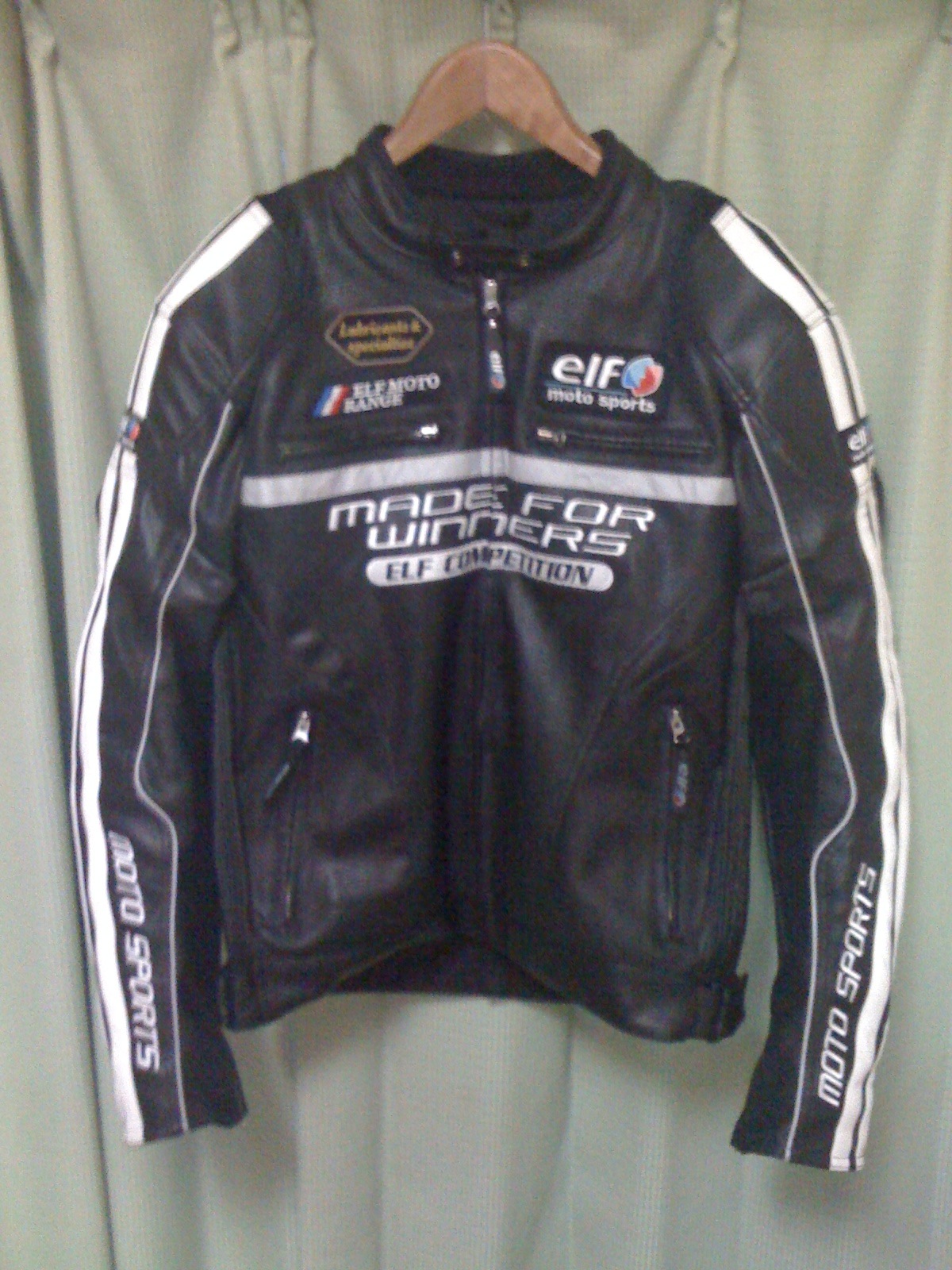 EL- 0223である。同じくELFのジャケットなんだけど、素材がフェイクレザー(合皮)、肩、肘、脊髄パッドが標準装備である。やっぱ、ニセとはいえ、革ジャンだけあってかっちょえー。もう、先ほどのEL-0221Ltdはどこへやら、すっかりEL-0223が気に入ってしまった。で、気になるお値段の方なのだが(21500円)、俺にとっては高い、んだけれども、ニセ革ジャンなんで、本物の革ジャンよりは数段安い。昔は革ジャンを何着か持っていたけれど、それにくらべれば、うそみたいな安さである。「転んでも安全だし、かっちょええし、3シーズン着れるし、何年も着れるし.....」、よーく考えて (約6秒ぐらい)、「おじちゃん、これちょうだい」と言ってしまったのである。色はBK/BK(黒/黒)、サイズは3L。着てみたけど、ちょうどピッタリ。俺にあつらえたようなサイズである。腕に白い線が縦に2本、うーん、新ライダー1号かあ、とかくだらないことを考えてみたりして。